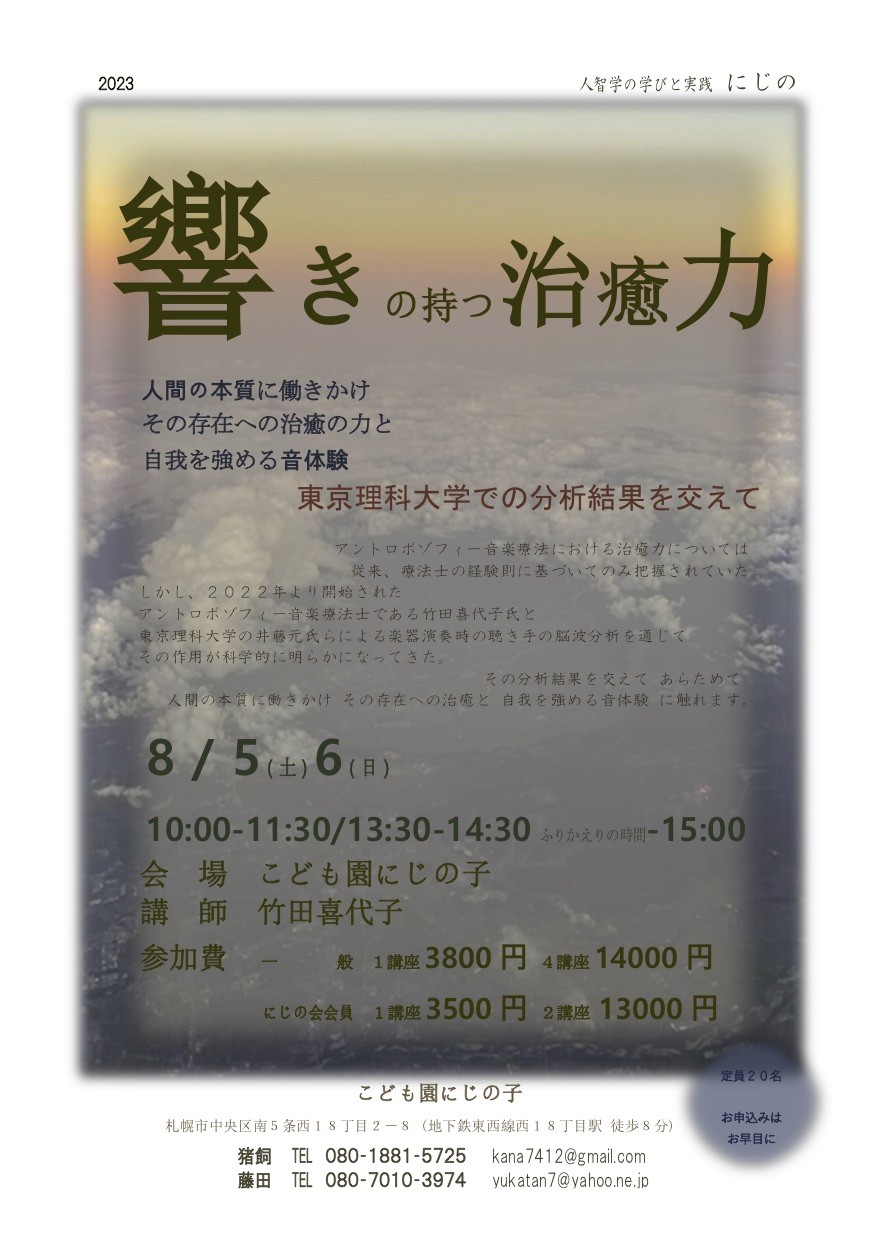 お知らせ 竹田喜代子 講演情報 タグ:アントロポゾフィー 音楽療法 人智学 音楽療法士 アウディオペーデ 音楽体験 竹田喜代子 音楽の本質 こども園にじの子 自我を強める 音体験 治癒力 2023-03-31 20:53:28 「響きの持つ治癒力」 日にち:2023年8月5日(土)、6日(日) 会 場:こども園にじの子(札幌市中央区) 人間の本質に働きかけ その存在への治癒の力と 自我を強める音体験 東京理科大学出の分析結果を交えて... 詳細はちらしをご覧ください。 お申込み 猪飼:kana7412@gmail.com / phone 08018815725 藤田:yukatan7@yahoo.ne.jp / phone 08070103974